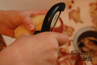 Little Chef C decided we should peel the potatoes. She didn’t like the imperfections on the skin and did not want to “eat those parts.” This time I tried being smart and had her peel the potatoes into the sink. She is ALWAYS loosing a potato or a peeler in the garbage. She was doing well and I was just about to make a comment about not loosing a single potato when she dropped one in the sink and down the disposal! That potato went straight in the garbage!