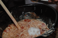 She then poured in the green enchilada sauce and the tomatoes.