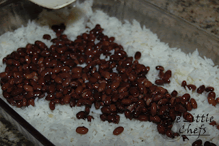 She then dumped the rice in the pan and the rinsed beans on top and spread them out the best she could.