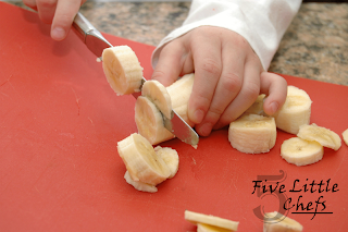 Little Chef D cut the banana with a butter knife. That is the safest for her to use and it was fine because bananas are so soft. I showed her what size to cut them and instructed her to cut them thin, not too fat. With each cut she made she said, “Is this too large?” Sometimes I answered yes, sometimes no. The sizes did vary, but that is what I have come to expect, especially for Little Chef D.