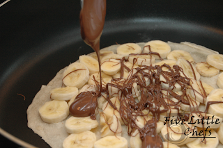 She was very careful in her placement of the bananas on the tortilla. So careful in fact, I turned the heat off, then when it was completely topped turned the heat back on. She loved drizzling the chocolate nutella which we used instead of chips.