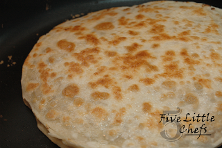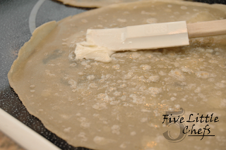 We were using tortillas that need to be cooked. These are a staple in our home so all the Little Chefs know how to cook them. Little Chef D lightly browned both sides of two tortillas. I had made some spreadable butter earlier in the day because we just ran out, she used that on one side of each tortilla.