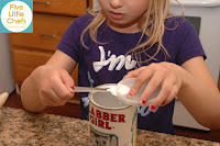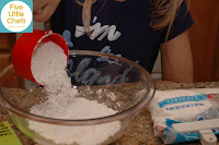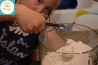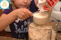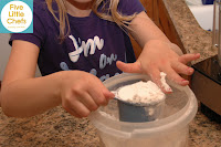 Little Chef A watched a Giada episode we had saved. Strawberry and Rosemary Scones was one of the recipes featured. Little Chef A immediately wanted to make these scones. We had blueberry and grape jelly in our home, but she insisted we use strawberry jam “like Giada.” How could I say no at that point? We immediately went to the store and got strawberry jam. The scone mix was easy to make. The ingredients were measured out and added to a food processor. “I can’t believe we have to make a mess on the counter. It takes a long time to clean it up since the flour is puffy.” “I like this cup its a lot easier (to measure) the flour.” — We keep a measuring cup in the flour and the sugar. The problem with this measuring cup is the 1 cup fill line is below the rim of the cup. After teaching my Little Chefs how to level off they are frustrated when they cannot level off with this cup. That is why Little Chef A needed to use another one.