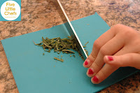 Little Chef A cut some rosemary from our garden! I showed her how to pull the leaves off backward. She said, “Why can’t we just pull them off carefully. Whenever I pull off the leaves I pull off the stem.” She also noticed the smell of fresh and dry rosemary are different.