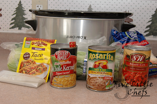 That’s it! Let it cook in the slow cooker or put it on the stove top for 30 minutes to warm it up if you are short on time. The eating part is also fun for the Little Chefs. They are able to add topping. We like to add crushed tortilla chips, cheese or sour cream. This last time we added fresh tomatoes because we had them and it was so good! We will do that again, especially in the summer time when we have fresh, out of the garden tomatoes!